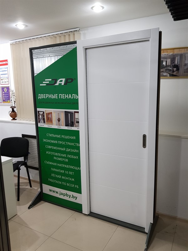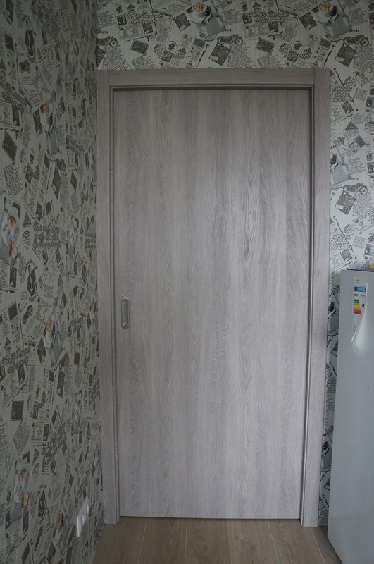 Самая простая и распространенная конструкция. Полотно одностворчатой двери прячется в кассету справа или слева от проема.